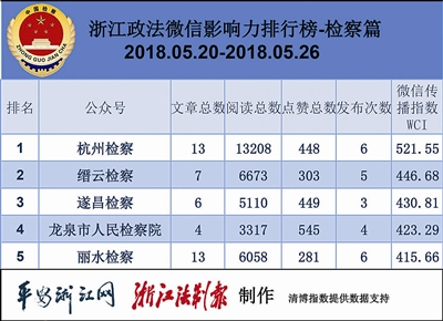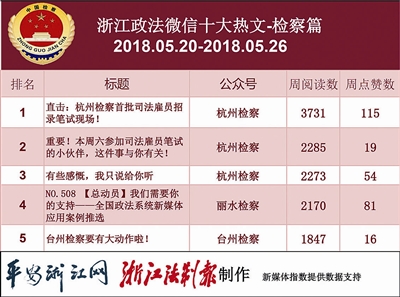 本期检察院榜,老将“杭州检察”夺魁,并包揽热文榜前三。最热一文是《直击:杭州检察首批司法雇员招录笔试现场!》看来,大伙儿对司法雇员招录考试还是挺好奇的。