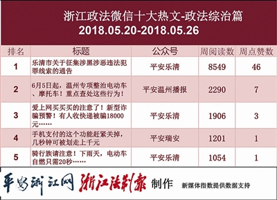 时隔一期,“平安乐清”重归榜首。《乐清市关于征集涉黑涉恶违法犯罪线索的通告》一文阅读数领跑榜单,点赞数也颇为可观。扫黑除恶,我们绝不手软。