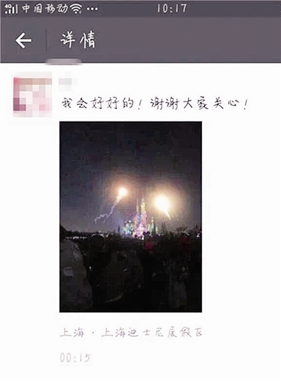 到了4月3日,洪某的朋友圈更新:我会好好的,谢谢大家关心!而发朋友圈的地址是在上海迪斯尼。