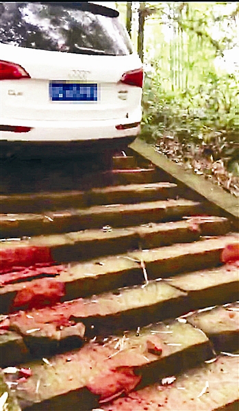 当地景区工作人员表示,越野车经过的这条路确在流米寺景区内,修建已经有20多年的时间,是游客步行进入寺庙参观的主要通道。这段楼梯有40多米,两辆越野车驶过后,其中的绝大多数台阶都被损坏。