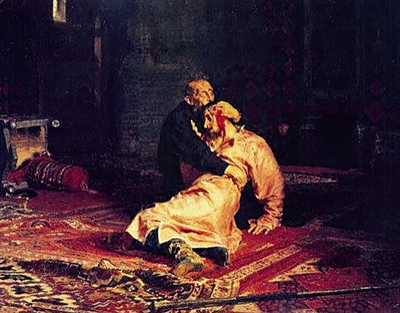 《伊凡雷帝杀子》由俄罗斯著名现实主义画家伊利亚·列宾于1885年创作,同年即被特列季亚科夫画廊创办者帕维尔·特列季亚科夫买下收藏。画作描绘了俄罗斯历史上首名沙皇伊凡雷帝暴怒之下不慎用权杖将心爱的儿子打伤致死的场景。画作中,伊凡雷帝双目惊恐圆睁,试图挽回头部流血的太子伊凡的生命。