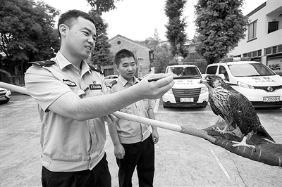 本报讯 近日,台州市公安局黄岩分局头陀派出所的院子里,飞来一只“怪鸟”。民警们经过查询,发现这是国家重点保护野生动物游隼。因为翅膀受伤,它已无法正常起飞。民警们便用纸箱给它做了个窝,并用猪肉喂养,同时联系了林业部门。昨日,这只游隼被移交给了林业部门。图为民警们用猪肉喂养受伤的游隼。