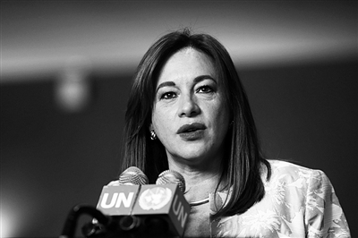 图为埃斯皮诺萨在当选第73届联合国大会主席后向记者发表讲话。