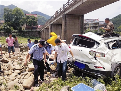 车子翻落桥下 警民合力救援