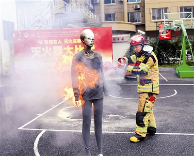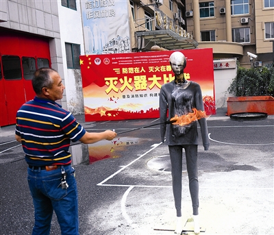 消防员点燃模特身上的衣物,模特身上出现明火。灭火比对实验开始。