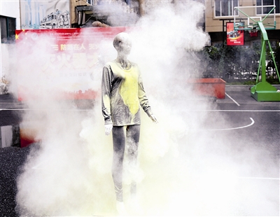 实验准备:此次实验,消防员准备了一套常见的全棉内衣,套在实验模特身上,为确保实验效果,消防员还在衣物上浇入了少量助燃剂。