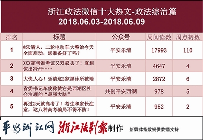 本期排行榜中,“平安乐清”继续稳坐榜首、并包揽热文前三。其中,《@乐清人,二轮电动车大整治今天全面启动,您准备好了吗?》一文的阅读量和点赞量双双领先。由于缺少防护,电动车出行需要加倍注意安全,希望大家遵守交通规则,平安出行。