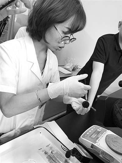 下一步实验,是验证杨梅注胶是否可行。工程师张佳凤用针管将明胶注进杨梅的果肉里。可是注胶的过程并不顺利。记者现场看到,虽然张佳凤极其缓慢地按压针管,但注入杨梅的胶水还是会不断地从针头处或杨梅的纹路里溢出来。一管约1毫升的食用明胶全部注入到一颗杨梅里,用时大约5分钟。而在放置冰箱冷藏后称重,这颗原本17.12克的杨梅注胶后的重量为17.39克,仅增重0.27克。