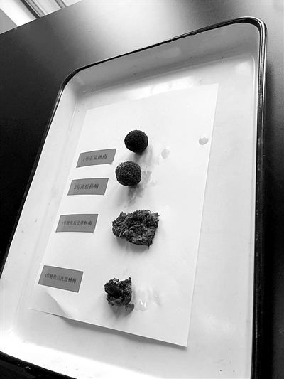 实验开始后,一名杭州市食品药品检验研究院的工作人员从冰箱中取出前一天晚上购买的新鲜杨梅。她随机取出一颗,直接用镊子取下一点点果肉,放在体视显微镜下进行观察,果肉呈饱满的红色柱状组织;然后取出另一颗杨梅在自来水下反复搓洗,的确出现了一些胶状物质,工作人员把这些胶状物质放在显微镜下进行观察,看到的是跟前面那颗一样的红色柱状组织,只是不太饱满;随后,工作人员又把食用明胶放在显微镜下,看到的则是无定形半透明的固体。