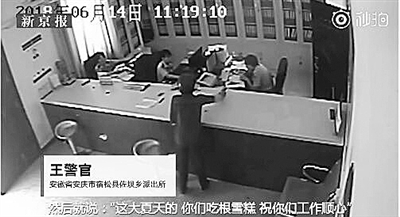 近日,安徽省宿松县,一位大妈走进派出所,默默在民警的桌前放下几块雪糕后就跑了。原来,大妈为感谢民警办事高效,特地买来雪糕送他们,怕民警不要,便放下雪糕立即离开了。民警说,当时一楞,然后觉得这大妈太好了!
