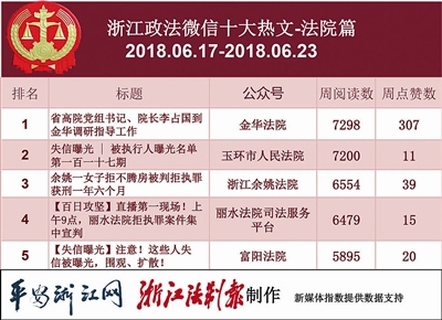 本期法院榜,阅读量最高的是“金华法院”的《省高院党组书记、院长李占国到金华调研指导工作》,其他热文以打击“拒不执行”类为主。打击“老赖”真是热度不变的话题。
