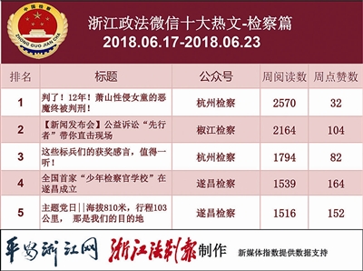 本期检察院榜,”杭州检察“继续领跑热文榜,文章《判了!12年!萧山性侵女童的恶魔终被判刑!》受到广泛关注。侵害未成年人的恶魔最终受到应有的法律制裁,大快人心!