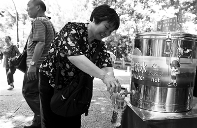 昨天,在杭州西湖雷峰塔旁的“凤凰岗”服务点,游客和市民在取水;走累了,也可以在岗亭里吹吹风、歇歇脚。