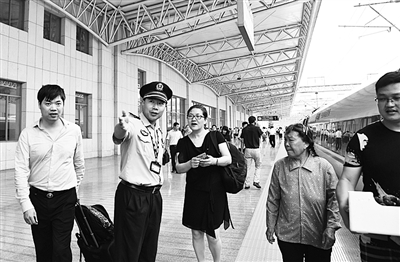 7月1日上午7时45分,三门火车站首列三门驶往上海的动车缓缓驶出站台。为确保首批旅客安全上车,三门火车站派出所民警全心为旅客提供服务,情暖旅客出行路。图为民警引导旅客前往指定车厢上车。