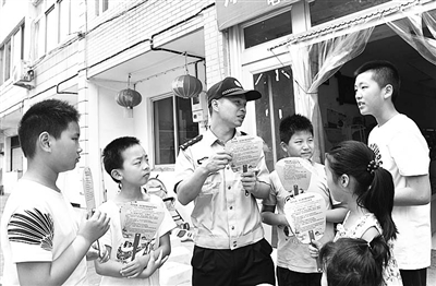 进入暑假,为防止溺水事件,连日来,三门县公安局健跳派出所组织民警深入辖区溪河、水库排摸险情,进村居开展防溺水宣传,提醒村民看管好孩子,告诫学生不要私自下河游泳,并向大家讲解自救常识。图为7月3日上午,民警向学生发放写有防溺水知识的小扇子。