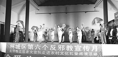 柯城区反邪教文艺下乡巡演活动在九华乡、石梁镇农村文化礼堂举行。天色渐暗,礼堂里五彩缤纷的灯都亮了起来,人头攒动,反邪教志愿者为大家表演了十几个戏曲类节目,赢得满堂彩。