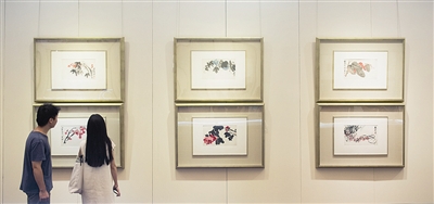 7月4日,观众在西泠春拍预展上参观画家齐白石的花卉册页。