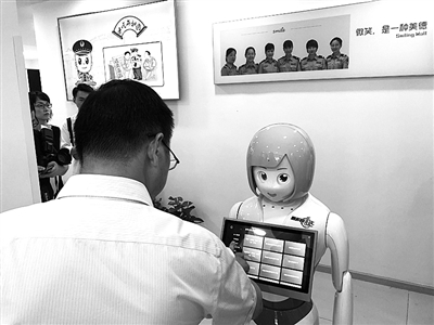 这里还设置了“智能导询机器人”,通过人脸识别、目标追随、语音合成、声纹合成等先进技术,以语音对讲和屏幕展示等多种方式实现信息交互,提供办事咨询、大厅导询、智能讲解等服务。