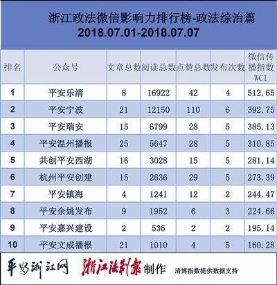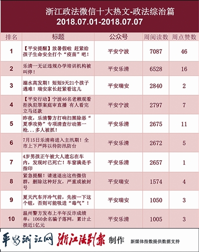 “平安宁波”奋起直追,热文《【平安提醒】放暑假啦 赶紧给孩子生命安全打个“疫苗”吧!》受到广泛关注,阅读数和点赞数双双领跑榜单。实力老将“平安乐清”表现不俗,《乐清一无证违规办学培训机构被叫停!》一文提醒大伙儿,选择培训机构务必“擦亮眼睛”。