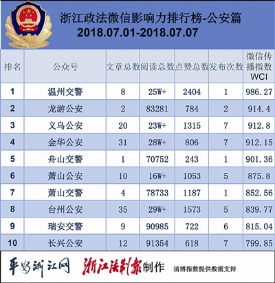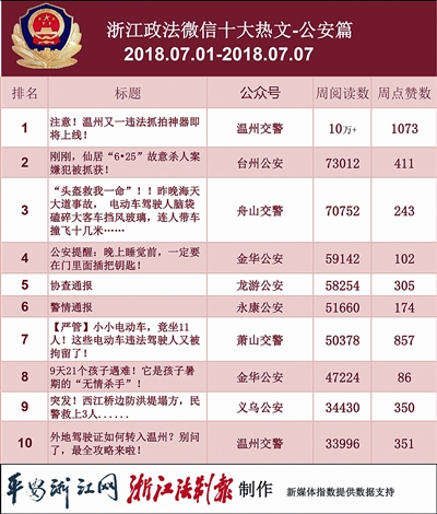 本期公安榜,“温州交警”一马当先,该公号的《注意!温州又一违法抓拍神器即将上线!》是热文榜中阅读数唯一冲上10万的文章,点赞数也颇为可观。高科技执法“神器”上线,精准打击交通乱象,值得点赞!