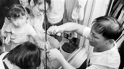 当日中午,东塍派出所民警接警后迅速赶到现场,此时小女孩右手的4个手指因被牢牢卡在玻璃门縫里,已经有些发黑,小女孩也哭闹不止。为了安全地把小女孩的手拿出来,民警决定把玻璃门卸下来。现场群众纷纷拿来工具,自发加入救援。在警民的配合下,玻璃门很快被卸下,小女孩成功获救。