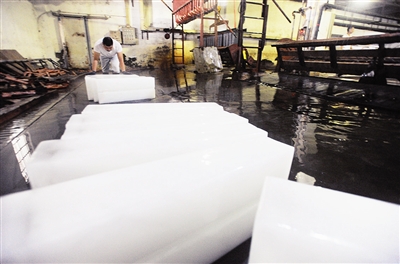 7月16日,在江苏省苏州市南环桥农副产品批发市场的制冰车间,一名工人在搬运冰块。持续的高温让当地冰块热销。新华社 杭兴微 摄