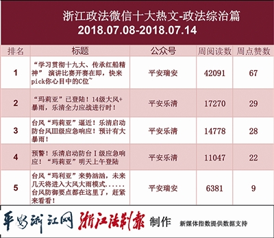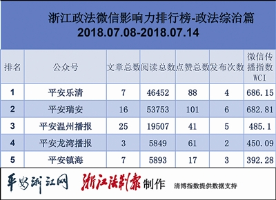 “平安瑞安”跃居政法委排行榜第二,其《“学习贯彻十九大、传承红船精神” 演讲比赛开赛在即,快来pick你心目中的C位~》一文,获阅读量和点赞量双双第一。实力老将“平安乐清”依然稳居第一,其两篇关于超强台风“玛莉亚”的文章,阅读量分别位列第二和第三。