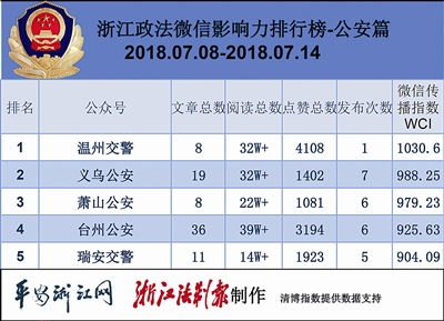 本期两篇阅读量超10万的文章,均来自公安系统。其中,来自“温州交警”的《危险!“玛莉亚”来袭,避开这137处高危地带!》一文,占据阅读量和点赞数首位。来自“温州交警微发布”的《注意!温州将启用鸣笛抓拍设备,查处“乱鸣笛”》一文也创造了阅读量10万+的好成绩。