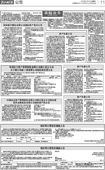 中国东方资产管理股份有限公司浙江省分公司 关于浙江环新工贸有限公司债权的处置公告