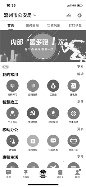 温州市公安局以“信息沟通安全放心、队伍管理在线贴心、警务保障惠警暖心”为重点,将“钉钉警务”生态建设作为“警务改革攻坚年”行动和推进公安机关内部“最多跑一次”改革的重点,在全局范围内形成共识,推动“钉钉警务”生态构建在速度、深度和广度上实现全面突破。据悉,在温州市公安局已经上线的智慧政工、移动办公、警务保障等4大类50项具体应用,总使用量已突破100万,为民警办事节省时间近百万小时。不仅温州市公安局被评为全国“钉钉警务”创新先锋单位,浙江省公安厅也在全省公安机关推广温州市公安局应用“钉钉警务”推动公安机关内部“最多跑一次”经验。