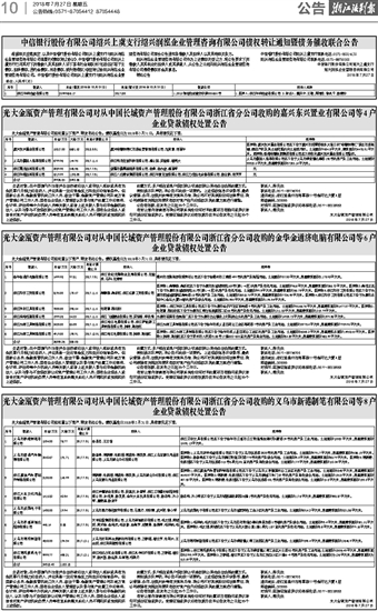 光大金瓯资产管理有限公司对从中国长城资产管理股份有限公司浙江省分公司收购的金华金通济电脑有限公司等6户企业贷款债权处置公告