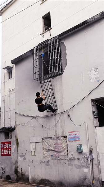 随后进行的是楼上人员逃生实验。只见楼上被困人员打开了开合式防盗窗,将安全绳固定在防盗窗顶端,在做好安全防护措施后,利用安全绳缓缓下降至地面。