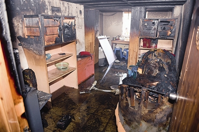 这是一处典型的“三合一”店铺,虽然所有人员已经搬离,但现场仍可以看出当时店铺经营时存在的消防安全隐患:收银台旁的过道上堆放着大量杂物;未与店堂硬隔离的厨房内违规使用煤气灶等明火灶具;灶具边上堆放有大量可燃物品;而更要命的是,厨房上方的阁楼便是店主的住宿区,有且仅有一个宽约50厘米的木楼梯连通。