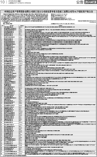 中国信达资产管理股份有限公司浙江省分公司拟处置中基日造重工有限公司等88户债权资产的公告