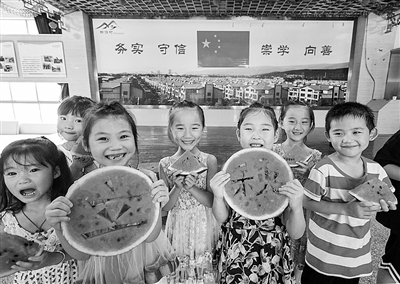 今天是“立秋”。昨日,长兴县煤山镇新源村文化礼堂内,青年文化志愿者正和村里的留守儿童一起吃西瓜“啃秋”,以此表达“啃下酷夏、迎接秋爽”,体验中国传统民俗。