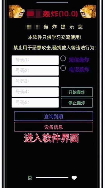 2017年以来,“阿水工作室”制作了“狮王轰炸”“呕死他”等短信、电话轰炸软件10余款,通过用户付费使用的方式进行牟利,共计注册用户达10万以上。通过“狮王轰炸”等短信、电话轰炸软件,买家每天都可以对多个目标手机发起轰炸,短短两分钟内就可以发送100余条短信进行骚扰,每天轰炸次数可达亿次以上。