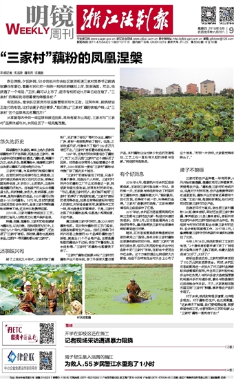 昨日傍晚,夕阳斜照,50岁的杭州市余杭区崇贤街道三家村党委书记姚炳财蹲在荷塘边,看着村民们把一网兜一网兜的鲜藕拉上岸,笑容满面。然后,他拨通了一个电话:“王所,藕可以上市了,超市专柜的设计方案已经在做了,‘三家村’的商标我寻思着要放得醒目些!”