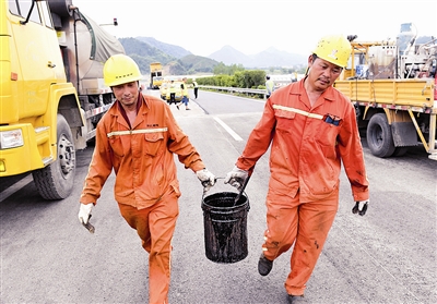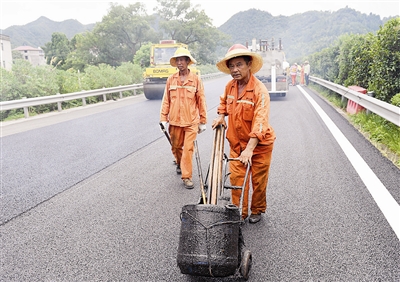 8月7日下午1时许,正是一天里日头最猛的时候,记者来到黄衢南高速公路衢南段沥青铺筑作业的施工现场。沥青路面腾起的滚滚热浪,让人有点透不过气来,现场的养护工人们不时提醒记者注意安全,“刚铺的沥青和机器旁边的温度很高,千万别靠太近”。