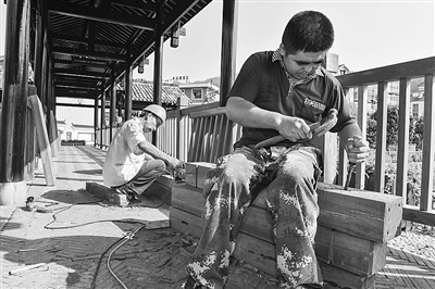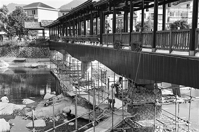 8月9日,淳安县下姜村村民正在整修村里的一座廊桥。他们除了对桥墩进行加固外,还将桥上有腐烂迹象的木制围栏全部更换,排除安全隐患,确保村民和游客的安全。