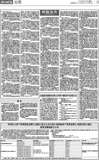 中国东方资产管理股份有限公司浙江省分公司与浙江省浙商资产管理有限公司债权转让通知 暨债务催收联合公告