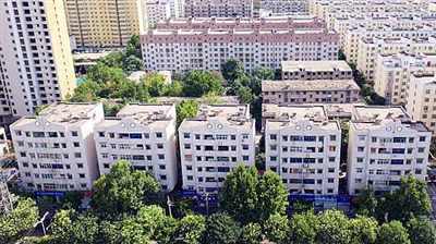 | 河南平顶山煤矿机械厂生活区未拆迁的老房子(前排),这些房子的窗户大多被开发商砸掉,返迁群众就生活这里 |