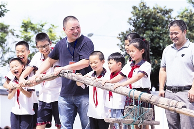 当天,参观者们通过体验摇橹、纺棉线、操作老收音机等,深切体会改革开放带来的巨大福利。图为德清县人大代表陈国根指导小朋友如何摇橹。