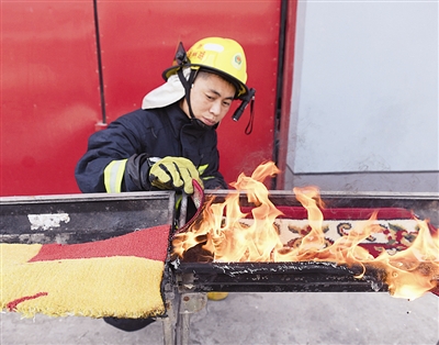 随后,消防员把普通的地毯、窗帘和沙发模拟成家庭摆放的场景,测试火灾发生后火势的蔓延速度。只见地毯被明火引燃后,仅仅不到1分钟,沙发和窗帘都很快被引燃,而且在火势的相互影响下,蔓延速度非常恐怖。