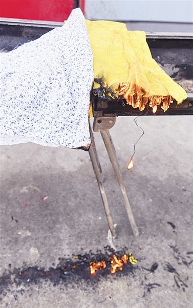 15秒,经火把明火的炙烤,2块地毯都未被引燃,但现场开始散发出塑料烧焦后的臭味。