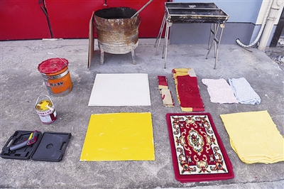 消防人员准备了各类实验道具,包括红外线测温仪、火把、灭火器,为使实验效果更直观的2个金属铁架子,并按照防火和不防火的性能,准备了装修时常见的地毯、窗帘、涂料三种材料。