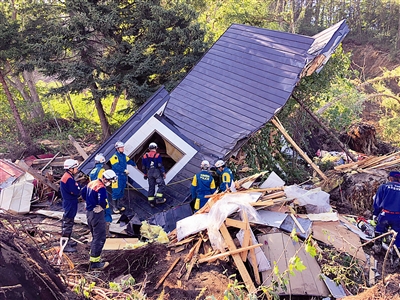 9月6日,在日本北海道厚真町,救援人员在一处倒塌的房屋附近搜救。