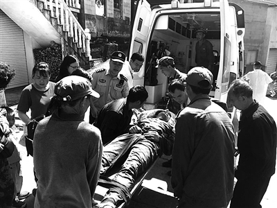 民警立即赶往现场,发现一中年男子倒在地上,腰部、头部等处受伤。民警和赶到的医护人员迅速用毛巾和帽子帮男子止血,随后合力将他送上了救护车。