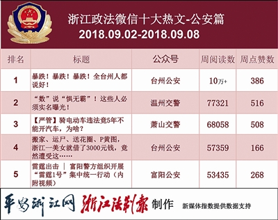 本期公安榜上,“台州公安”的热文《暴跌!暴跌!暴跌!全台州人都说好!》阅读数突破十万,这篇拥有“谜”一样标题的热文,实际上讲述的是台州市溺水死亡人数的暴跌。看来,台州预防溺水全民大行动取得了明显成效,为他们点赞!