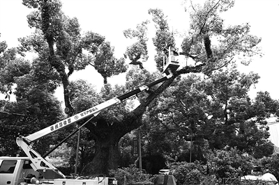 昨天,温岭市农林局组织古树名木救护人员,为泽国镇山南村两株有600多年树龄的国家一级保护古树做养护,除去枯枝腐枝,在伤口处涂抹上保护剂,既消除安全隐患,又促使老樟树抽发新枝。