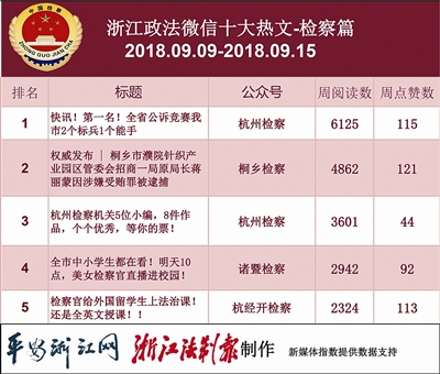 本期检察榜,“杭州检察”排名第一,他家的《快讯!第一名!全省公诉竞赛我市2个标兵1个能手》同时获最高阅读量,另一篇美文《杭州检察机关5位小编,8件作品,个个优秀,等你的票!》也在热文榜单上排名第三。